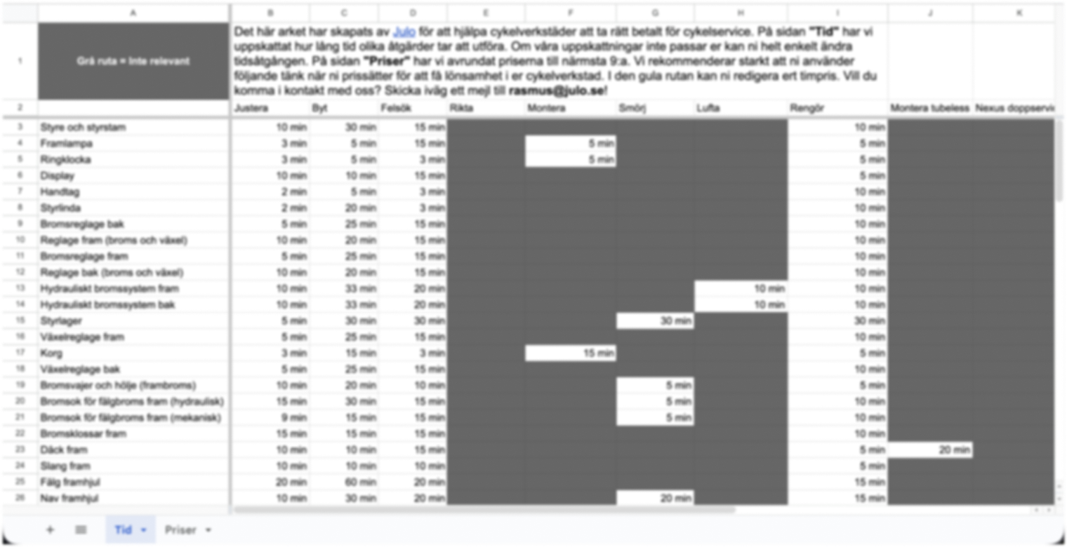 Ett praktiskt Excel-ark som hjälper er ta rätt betalt för cykelservice. Se uppskattad tidsåtgång för vanliga åtgärder, justera efter er verkstad och få stöd i hur ni kan prissätta för bättre lönsamhet.