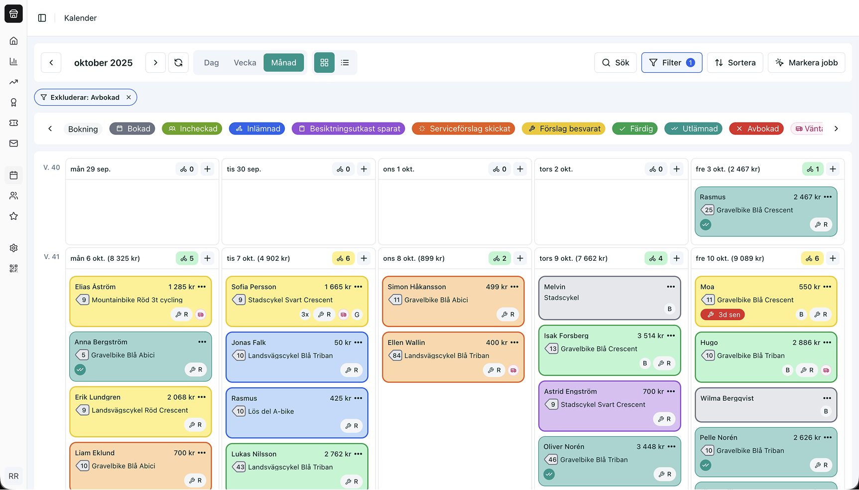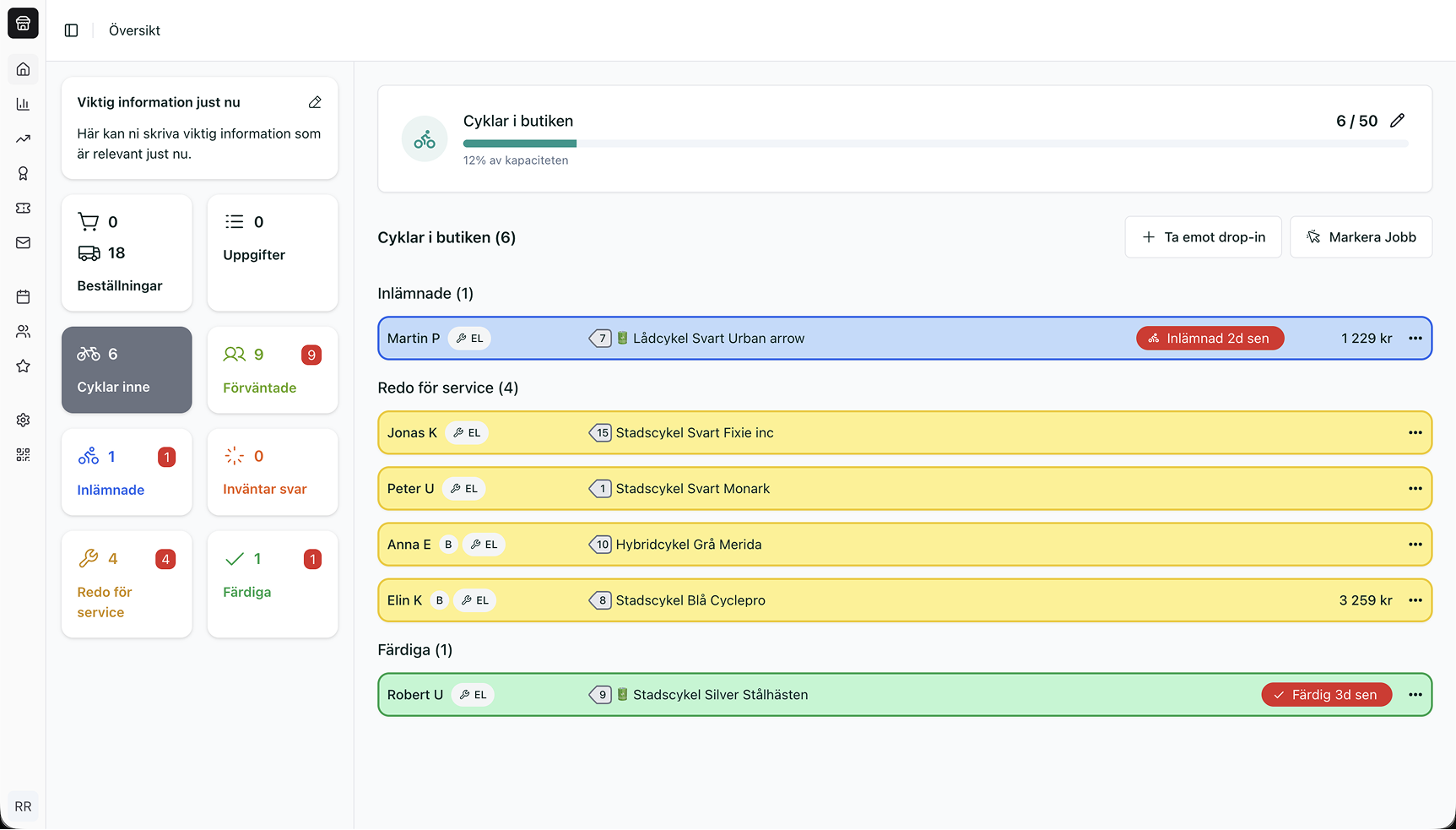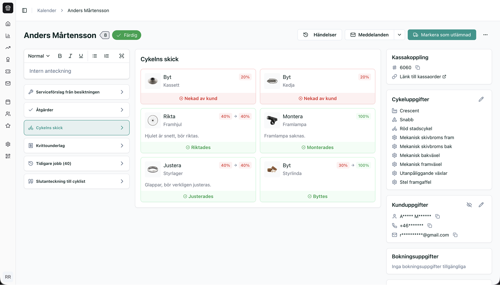 Alfred samlar kund, cykel och jobb i ett tydligt flöde. Mindre avbrott, nöjdare kunder och bättre planering – även när det är fullt i verkstaden.