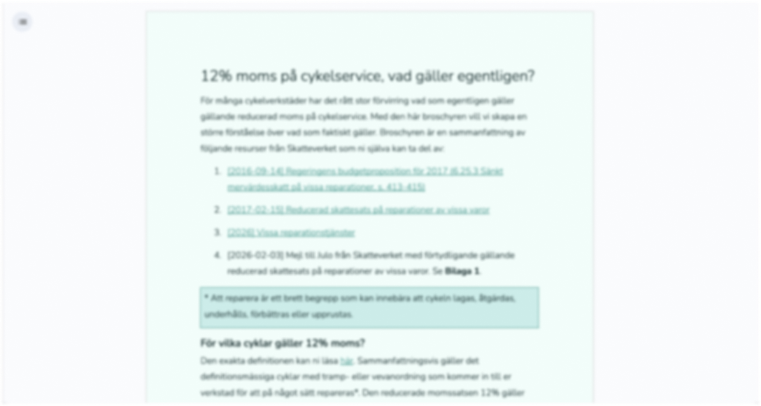 Vad gäller egentligen för moms vid cykelservice? I denna PDF har vi sammanställt allt ni behöver veta om 12 % moms på arbete och produkter – baserat på dialog med Skatteverket.
